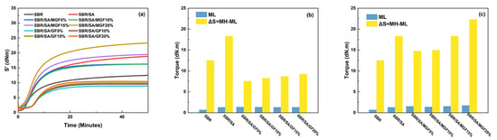 Figure 9a displays the vulcanization curve of the SBR rubber composite; the vulcanization characteristics including the ML, MH, and the difference between the maximum and minimum torque (ΔS) of the composite system are presented in Figure 9b,c. ML is typically associated with the viscosity of the rubber compounding system [49]. By comparing Figure 9b,c, it can be observed that the addition of SA, GF, and MGF leads to an increase in the viscosity of the composite system. Moreover, as more fibers are added to the SBR matrix, the composite system exhibits higher viscosity [50].
