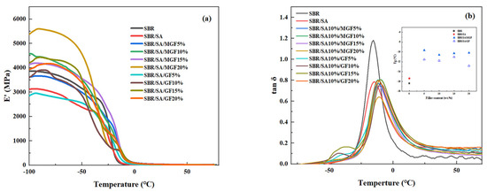 Dynamic mechanical properties of SBR/SA/GF, SBR/SA/MGF composites, E′~T (a) and tanδ~T (b).