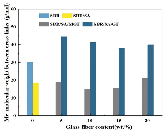 As seen from Figure 11, the Mc of SBR/SA/MGF specimens reduced from 21 to 15 g/mol when the content of MGF content increased to 10 wt%, meaning the crosslinking degree of the resulting products increases in an obvious way, which is consistent with the results obtained from vulcanization characteristics.