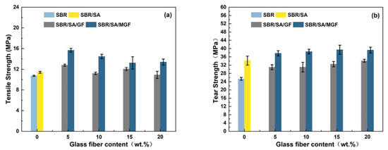 Tensile strength (a) and tear strength (b) of SBR/SA/GF and SBR/SA/MGF composites.