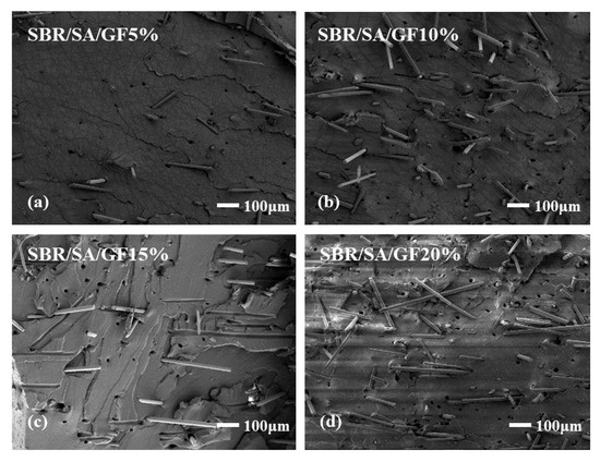 To examine the interface state of the composite rubber material, the tensile section’s microscopic morphology was observed by SEM, as presented in Figure 13. It is observed that the fibers on the tensile fracture surface of the SBR/SA/GF composite are arranged in a disorderly way, and some fibers are pulled out on the fracture surface.