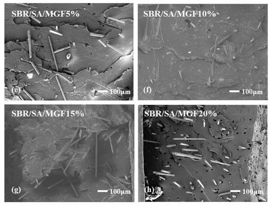 SEM images of SBR/SA/GF5% (a), SBR/SA/GF10% (b), SBR/SA/GF15% (c), SBR/SA/GF20% (d), and SBR/SA/MGF5% (e), SBR/SA/MGF10% (f), SBR/SA/MGF15% (g), SBR/SA/MGF20% (h).