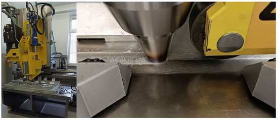 The research object was a 3 mm thick butt joint of plates of the AA6061-T6 aluminium alloy and S355 steel, made using the ESAB FSW LEGIO 4UT machine (Figure 1). The dimensions of the welded plates and their actual form are shown in Figure 2.