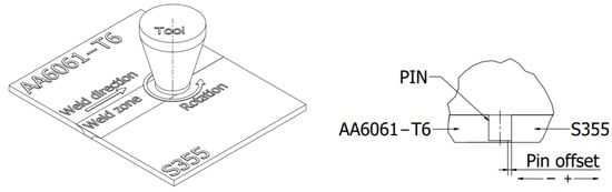 The dimension between the side surface of the tool and the side surface of the steel sheet forming the contact lines between the sheets prepared for welding is defined as the offset parameter. The interface between the sheets is the zero value of the offset parameter, while moving the tool toward the steel plate generates a positive offset value. The definition of the offset is shown schematically in Figure 3. The joints were made using three different positions of the tool offset. The offset values and other welding-process parameters used in the tests are provided in Table 3. S355 steel was welded with the AA6061-T6 aluminium alloy under conditions of tool offset control with tool penetration depth control. The welding parameters were selected based on the authors’ own experience and the results of tests carried out at other research centres for other steel grades and aluminium alloys.