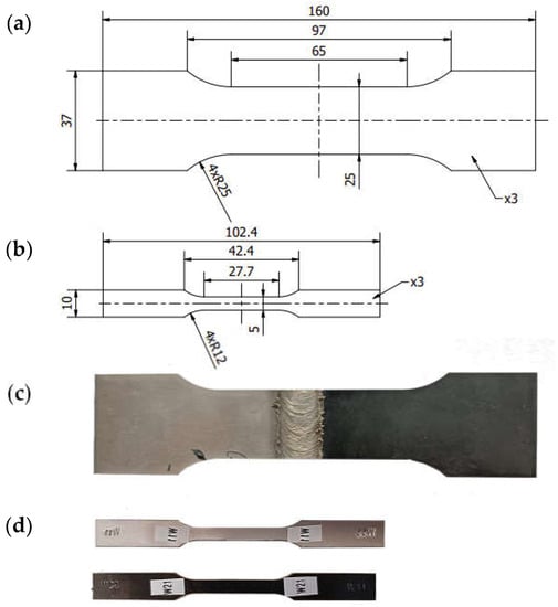 Dimensions of joint specimen W2.0 (a); dimensions of base material specimen W1.1 (b); W2.0 specimen cut from joint (c); W1.1 specimen cut from base materials (d).