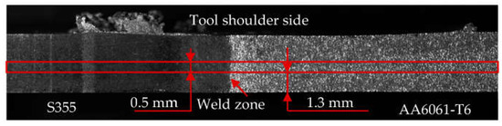The subject of the tests was a 3 mm thick butt joint made by friction stir welding (FSW) of AA6061-T6 aluminium alloy and S355 steel. Both base materials of the joint are widely used structural materials. Aluminium alloy AA6061 is a typical 6000-series-grade alloy with Mg and Si as the main alloying elements. AA6061-T6 is a heat-treated, precipitation-hardened 6061 aluminium alloy, which is one of the most popular alloys of this series. It is used in the automotive, aviation, marine, and rail industries [26,27,28,29]. It has gained popularity thanks to its light weight, high ductility, and excellent corrosion resistance [30]. Its chemical composition is specified in Table 1.