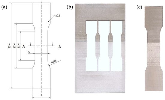 The strength properties of the base materials were tested using the macrospecimens shown in Figure 4 designated as W1.1 and manufactured in accordance with the EN ISO 6892-1 standard [32]. The specimens were cut out from S355-AA6061-T6 plates by electrical discharge machining (EDM).
