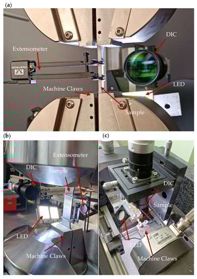 Micro-specimens were tested using the Micro Fatigue System (MFS) dedicated to static and fatigue testing of micro-objects [34,35]. Specimens in the MFS system are loaded using a nano- or microdrive. In the first case, a specimen is loaded using a piezoelectric actuator with a displacement resolution of 1.7 nm. The second drive system with a resolution of 1 μm is based on a precise electromechanical actuator. Given the small size of the measuring part of the specimens, the digital image correlation method [36] was used to measure the strain in the MFS system. In the DIC method, the measurement of the strain is based on the natural image of the specimen surface without additional markers applied. The image of the specimen surface is observed using VS Technology’s high-quality telecentric lenses with a micrometer-scale optical resolution and a high-resolution Basler Ace (Ahrensburg, Germany) camera. Figure 7 shows an overview of the MFS system in the measurement zone during the test.