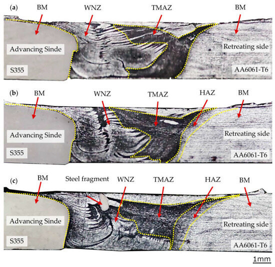 The TMAZ microstructure was characterised by highly elongated aluminium grains, which were arranged in stripes visible in Figure 10b,e,h, which were induced by the rotation of the pin. No differences in the TMAZ microstructure were observed between the different joint types. The WNZ mixing zone was characterised by highly refined and mixed aluminium grains. Similar observations were presented by the authors in [38].