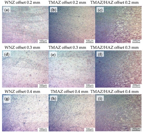 Microstructure of the S355/AA6061-T6 FSW joint, polarised photos. (a) WNZ offset 0.2 mm; (b) TMAZ offset 0.2 mm; (c) TMAZ/HAZ offset 0.2 mm; (d) WNZ offset 0.3 mm; (e) TMAZ offset 0.3 mm; (f) TMAZ/HAZ offset 0.3 mm; (g) WNZ offset 0.4 mm; (h) TMAZ offset 0.4 mm; (i) TMAZ/HAZ offset 0.4 mm.