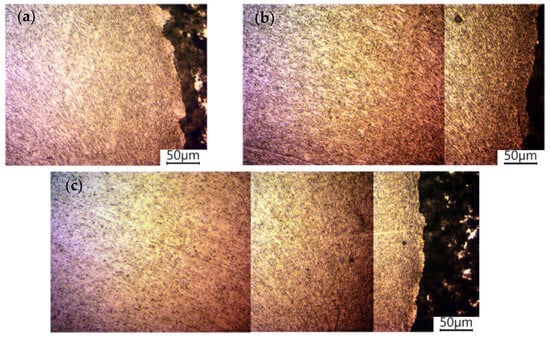 The reference for the joint material microstructure is the microstructure of the base material, i.e., AA6061-T6 aluminium shown in Figure 9. The size and shape of the grain corresponds to the typical microstructure image of this material [37]. Figure 10 shows a photo of the FSW joint microstructure for each analysed value of the offset parameter. The analysis covered WNZ, TMAZ, and HAZ zones. Figure 10c,f,i show the boundary of the transition between the heat-affected zone (HAZ) and the thermomechanically affected zone (TMAZ), which was clearly visible for each offset value. It was noted that HAZ and TMAZ developed a transition boundary characterised by an intermediate grain size. This boundary varied in width for different joint types. The width increased proportionally to the offset parameter. The microstructural differences between HAZ and BM were barely discernible, among other things, due to weak thermal influences.