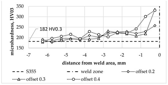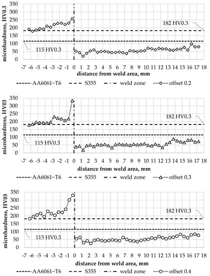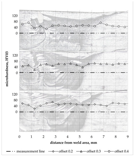 The hardness of the aluminium in the joint zone was noticeably lower in relation to the hardness of the base material. The hardness profiles on the aluminium side for individual offset parameter values are shown in Figure 15. They show up to a 3-fold local decrease in hardness, which corresponds to the data available in the literature on the hardness differences of AA6061 alloy in the T6 and O condition [39]. The lowest hardness value was observed in WNZ for each of the offset values analysed. The decrease in hardness in this zone confirms that significant grain-size reduction cannot compensate for the effects of the aluminium alloy structure’s recrystallisation under friction and the effects of a tool-induced plastic deformation.