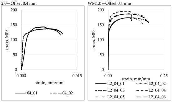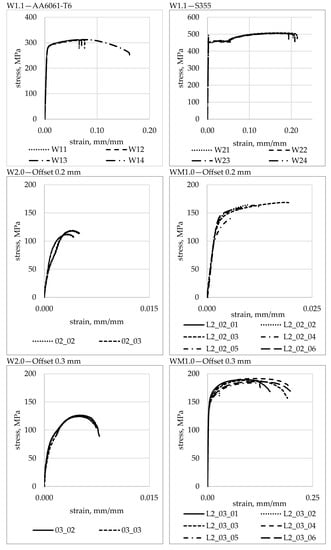 Stress-strain curves for base materials and W2.0 and WM1.0 specimens obtained from the analysed FSW joint types are shown in Figure 16.