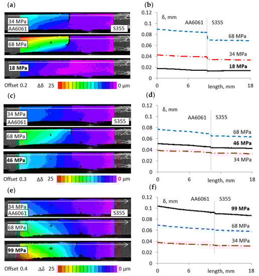 In order to illustrate the failure pattern of the joint, an analysis of the displacement distributions in the specimen during the monotonically variable tensile test was carried out. Figure 19a,c,e show example extents of displacement distributions Δδ in the load direction for specimens with 0.2, 0.3, and 0.4 mm offsets in selected loading phases: 34 and 68 MPa. Moreover, Figure 19b,d,f show displacement distributions δ in the phase of the joint integrity loss for the selected joint cross section indicated by the white axis in the figure. The lack of joint integrity causes a step change in displacement. By analysing the pattern of displacement changes along the specimen near the joint root (along the cross section marked with a white line in Figure 19a,c,e), the approximate value of the nominal stress S at which the joint lost its integrity in the analysed cross section was determined. For comparison purposes, the loss of integrity was assumed to occur when there was at least a 1 μm increase in the displacement in the transition line between the steel and aluminium alloy.