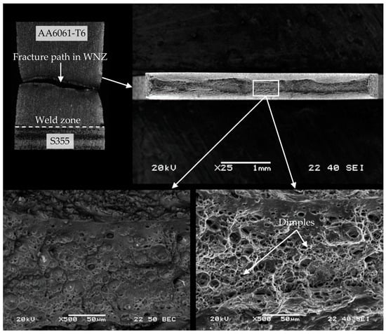 Fracturing of WM1.0 specimens prepared with an offset of 0.4 mm during the monotonic tensile test occurred mainly in the mixed WNZ zone. The fracture was mixed in nature with a predominance of dimples of various sizes characteristic of a ductile fracture (Figure 23). The characteristic features of the joint fracture for an offset of 0.4 mm consisted of fine and large steel inclusions formed during the FSW process, which changed the character of the fracture, and a significant reduction of the specimen’s thickness during the monotonic tensile test only in areas where no steel inclusions were observed. The much higher standard deviation value of the mean tensile strength of the joint made with a 0.4 mm offset than with a 0.3 mm offset resulted from steel inclusions of different sizes, which were also observed during microstructural analysis.