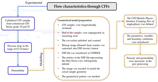 Experimental and CFD modelling procedures adopted to determine the porosity and permeability of CFFs of grades 30 and 50.