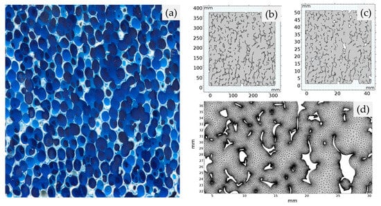Commercial CFFs of grades 30 and 50, measuring 584.2 × 584.2 × 50.8 mm, were used to create cylindrical samples. The filter samples were longitudinally sectioned, and half of the sections were impregnated with blue metallographic castable mounting resin using a vacuum mounting apparatus. This impregnation process enhanced the resin penetration into the voids and facilitated the release of any trapped bubbles. The surface of the sectioned sample, parallel to the height, was ground to remove excess resin and then polished to eliminate scratches and, thereby, obtain a smooth surface. A flatbed scanner (Perfection V330 Photo Scanner from Seiko Epson Corporation, Tokyo, Japan) with a resolution of 2000 dpi was used to scan the sample surface. The scanned images were processed to recover the geometry pattern of the CFFs for importation into the simulation software, i.e., into COMSOL Multiphysics® (version 5.3). Figure 2a–d illustrates the steps involved in preparing the geometric pattern. Figure 2a shows the scanned image of the CFF samples impregnated with castable resin, where the white filaments represent the filter Struts, and the blue regions represent the channels. By converting the scanned images into a vector format, distinct divisions within the image were created due to the colour contrast between the resin and the CFF material. In view of this, the bitmap images obtained from optical scanning were converted to the Drawing Exchange Format (DXF), as shown in Figure 2b, and then imported into the simulation software. The entities in the DXF file representing the filter Struts were subsequently deleted using the functionalities in the Model Geometry interface, resulting in Figure 2c. The image was then rescaled to match the actual sample geometry. Finally, as shown in Figure 2d, the models were meshed using the physics-controlled mesh sequence type with a standard element size.