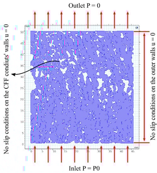 Figure 3 illustrates the geometric pattern of CFFs of grade 50 and the corresponding boundary conditions. The same boundary conditions were also applied to the numerical CFD model for CFFs of grade 30.