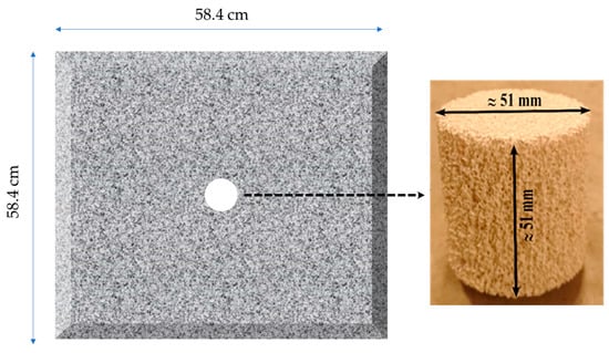 The CFF samples selected for the investigation were obtained by cutting commercial alumina (Al2O3) CFF tiles/blocks measuring 58.4 × 58.4 × 5.1 cm3 using a core drill machine, resulting in samples with a nominal diameter of 51 mm. As shown in Figure 4, the samples were taken from the centre of the tiles/blocks. To ensure accurate measurements, the samples were subjected to a specific drying process after being cut, as they were exposed to water during the cutting process, i.e., heated to 423 K for 12 h. Once completely dried, the weight and dimensions of each sample were promptly measured using precise equipment, with multiple measurements recorded for each parameter.