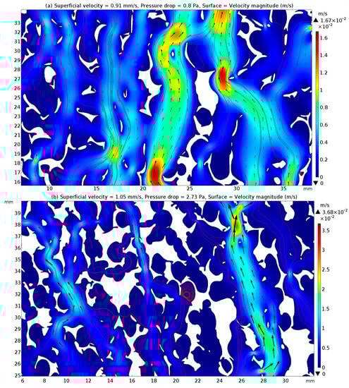 The velocity fields within the channels of the 2D geometric patterns of the CFFs were modelled by solving the Stocks equation in the creeping flow interface. Figure 4a,b present the velocity magnitude inside the channels of the CFFs of grades 30 and 50, respectively, using a colour map. The streamlines and velocity vectors represent the instantaneous direction of the fluid motion and the velocity magnitude, respectively. The colour contours indicate the local velocity magnitude, while the velocity vectors demonstrate that the interstitial velocity of the CFFs of grade 50 was higher than that of the grade 30 CFFs for approximately equal superficial velocities (≈1 mm/s).