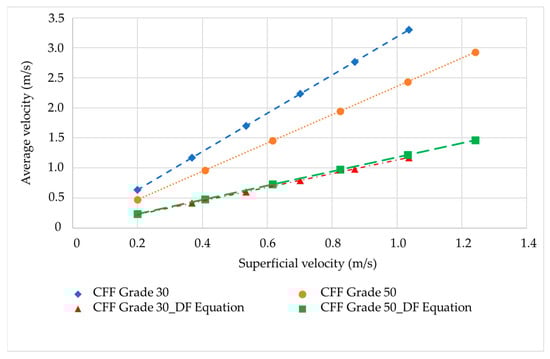 Figure 6 illustrates the correlation between the intrinsic velocity obtained from the numerical CFD model and the Dupuit–Forchheimer equation for values of superficial velocity ranging from approximately 0.2 to 1 mm/s for the CFFs of grades 30 and 50. The intrinsic average velocity obtained from the numerical CFD model proved to be higher than that obtained with the Dupuit–Forchheimer equation. The Dupuit–Forchheimer equation yielded equal average intrinsic velocities for the CFFs of grades 30 and 50, as the porosity is identical for both grades. However, the numerical CFD model indicated a higher average intrinsic velocity for the CFFs of grade 30 compared to the CFFs of grade 50. The lower average intrinsic velocity of the CFFs of grade 50 can be attributed to some disconnected channels, i.e., to dead zones, within the geometric pattern, which exhibits a nearly zero velocity magnitude.