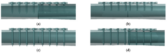 Configuration of plate–screw implant–bone fixation: (a) unicortical conventional (UC), (b) unicortical locking (UL), (c) bicortical conventional (BC), and (d) bicortical locking (BL).