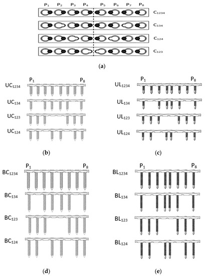 Screw configurations based on implant group (a) screw position, (b) unicortical conventional (UCn), (c) unicortical locking (ULn), (d) bicortical conventional (BCn), and (e) bicortical locking (BLn) where n is the screw configuration.