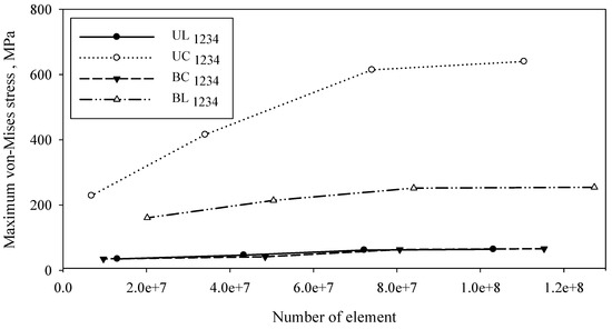 Tetrahedron element mesh was used for all models. Table 1 shows the statistics of mesh with nodes and elements of the level of element sizes for different types of implant configuration. The model validation is based on internal FE validation through convergence analysis. Figure 4 shows a convergence test performed for 16 types of configuration according to groups UC, UL, BC, and BU. Figure 5 shows the meshed model with an enlargement area for four variations of mesh: default, coarse, medium, and fine size. An element size of 0.4 mm with a transition ratio of 0.272 and a growth rate of 1.2 was used.