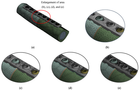 Meshed model with the enlargement area. (a) Meshed implant model (1.0 mm), (b) default, (c) 1.0 mm (coarse), (d) 0.6 mm (medium), (e) 0.4 mm (fine).