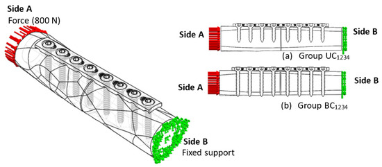 A constant load of 800 N was applied once the preliminary steps were achieved. It has been demonstrated to correspond to the load on the femur during regular activities such as standing up. The rationale relation between dynamic and static loading demonstrated that the average dynamic force applied on the femur is representative of the constant load based on human weight (i.e., 600 N, 700 N, 800 N, 900 N). Sides A and B represent the compression loading and constraint, respectively, and the schematic of these four loading conditions is illustrated in Figure 6a,b. This assumption approximates the actual condition of the anterior and posterior regions of the femur shaft. A simplified model was used to provide information about the screw–plate configuration affecting the mechanical behaviour of the bone–implant system [38]. This simplified model allows the parametric study of bone–implants involving stress distribution and stress shielding that influence the construct’s stability. The assembly force used in this study was applied as a compression rather than an impact, as is the case during surgery. A dynamic impact load can be replaced by compression as it results in a similar strength [39].