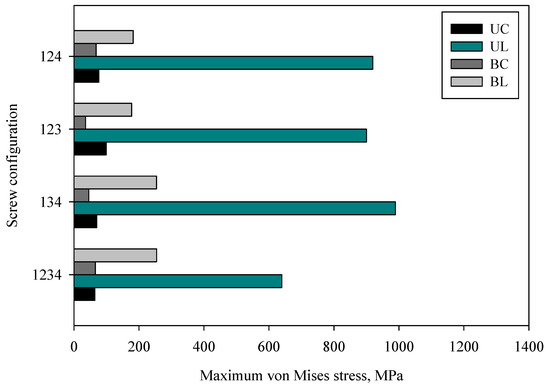 When the configurations of screw types were compared, group UC showed the highest strength of UC123 with a maximum of 99.24 MPa, followed by the UC124, which had a maximum stress of 76.78 MPa. The most stable construct was observed for UC1234, with a minimum stress of 64.48 MPa; moreover, this configuration had considerably larger stability than those seen for UC134, UC123, and UC124. The high stress of the implant leads to mechanical failure. However, the low stresses may cause stress shielding, which could lead to bone resorption and implant loosening [44].