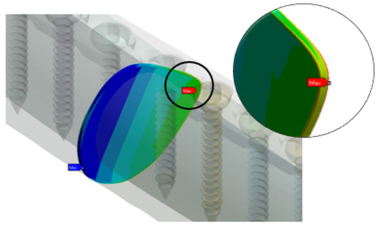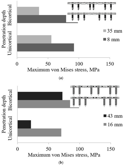 Figure 10b shows the screw strength of Groups UC and BC at both penetration depths. It seems that the average equivalent stress of 16 mm for the unicortical screw was higher than that of the bicortical screw; however, it was the contrary for 43 mm. As the innermost screws increased from 16 mm to 43 mm, the plate stresses of bicortical (99.24 MPa to 72.3 MPa) and unicortical (70.46 MPa to 21.51 MPa) types were reduced. The pull-out strength variance between unicortical and bicortical screws was between 26% and 44% [49]. Unlike unicortical screws, which experience high stress, it is inversely proportional to the working length. It also provides higher stress on the 16 mm compared with the 43 mm screws, on top of having different stress distributions. In general, both types of screw show that the unicortical was most affected by the plate stress compared with the bicortical screws for the working length range.