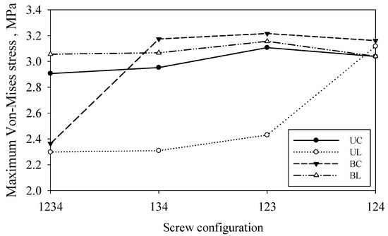 Figure 7 shows the effects of screw configuration on the implant stress for different screw types. In general, the different screw types and configurations yield a different stress distribution threshold. The results obtained for the Groups UL and BL were superior to those of Groups UC and BC. The implant strengths of Groups UC and BC were relatively lower and uniform. On the contrary, the strength of Groups UL and BL was rough and irregular. As the screw configurations changed, the implant strengths of both penetration depths were reduced, indicating optimal stability for bone–implant fixation.