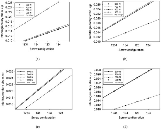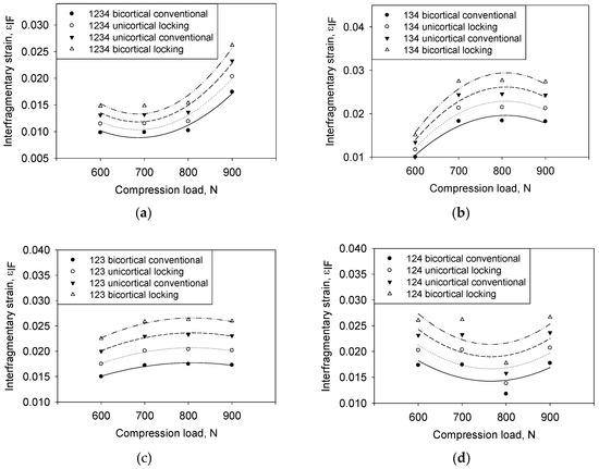Effect of compression load on the interfragmentary strain at different screw configurations: (a) 1234, (b) 134, (c) 123, and (d) 134.