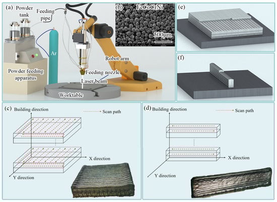 (a) Schematic diagram of the LMD system; (b) micromorphology of FeCoCrNi HEA powder; scanning mode (c) and product model (e) of bulk; scanning mode (d) and product model (f) of single wall.