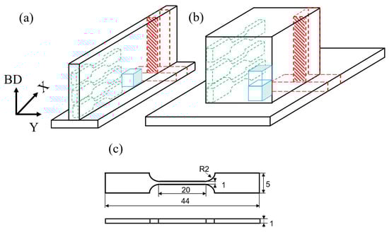 Schematic diagram of sample location and size: (a) sampling location of the single wall; (b) sampling location of the bulk; (c) tensile sample (in mm).