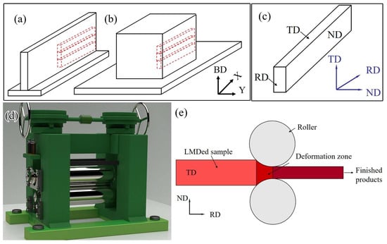 In this study, a rolling process was employed to induce continuous plastic deformation in the samples. Prior to rolling, the samples underwent a cleaning process using an ultrasonic cleaner. The rolling was performed using a Φ300 × 350 two-roll cold rolling mill. The dimensions of the samples were 50 × 5 × 2 mm3 (Length × Width × Thickness). The rolling process involved incrementally applying rolling deformation at 0%, 25%, and 50% increments. The rolling speed was set at 5 m per minute. Figure 3 illustrates the schematic diagram of the two-roll cold rolling mill and the rolling process. In the diagram, BD indicates the direction of addition, RD represents the rolling direction, TD stands for the cross-section, and ND refers to the normal direction.