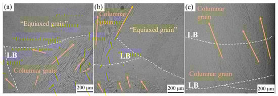Microstructure of FeCoCrNi-LMD bulk and single wall: (a) X-Z plane of bulk; (b) X-Y plane of bulk; (c) X-Z plane of single wall.(The orange arrow represents the growth direction of the columnar crystal.)