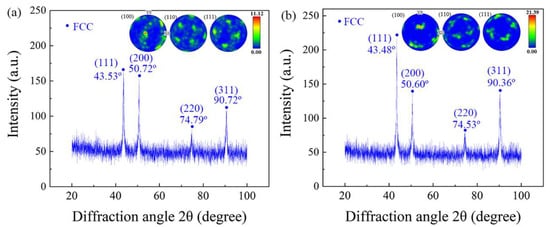 According to the XRD patterns of FeCoCrNi-LMD bulk and single wall, both of them are FCC, which is attributed to the high-entropy effect of HEA. In the crystal material, when the crystal structure of the tested sample presents different angles with the incident X-ray and conforms to the Bragg lattice equation (), the X-ray on the crystal plane with spacing d is incident at a certain incident angle θ, and the superposition diffraction peak results will appear in the diffraction pattern. For the XRD results in this experiment, both are FCC phase and belong to the cubic crystal system. Therefore, the calculation method of crystal plane spacing d is as follows: