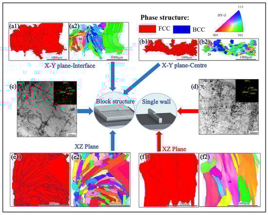 Figure 7 illustrates the EBSD-phase structure, EBSD-inverse pole figure (IPF), and TEM analysis of FeCoCrNi-LMD bulk and single walls. To analyze the difference between the X-Y lap joint and the non-lap joint in the bulk material, the grains were divided into two categories based on their position using the post-processing function of EBSD. One category consists of grains located at the overlap of the bulk X-Y plane, as shown in Figure 7(a1,b1). The second category encompasses grains positioned outside the bulk X-Y plane, as illustrated in Figure 7(a2,b2). In Figure 7(a1,b1,e1,f1), the phase structure is presented across various planes: the X-Y plane at the bulk material interface, the X-Y plane at the bulk material center, the X-Z plane of the bulk material, and the X-Z plane of the single wall. In the EBSD-phase structure, the FCC phase is highlighted in red, while the BCC phase is depicted in blue. Notably, both the bulk material and the single wall exhibit an FCC phase. Turning to Figure 7c,d, these images display the bright-field image and electron diffraction spots of the FeCoCrNi-LMD material. The presence of FCC phase is indicated by the electron diffraction spots in both images. This confirms that alterations in the scanning strategy do not impact the phase structure of FeCoCrNi-LMD.