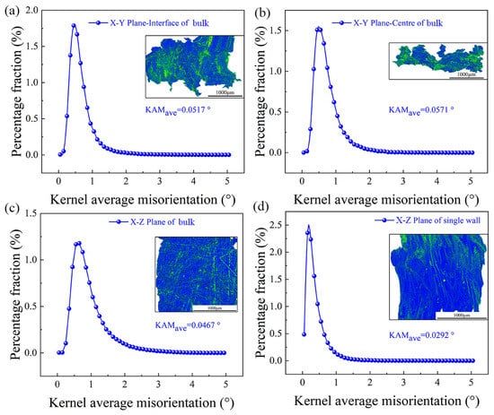 EBSD-KAM distribution curve and EBSD-KAM of the FeCoCrNi-LMD: (a) X-Y plane-interface of bulk; (b) X-Y plane-center of bulk, (c) X-Z plane of bulk, (d) X-Z plane of single wall.