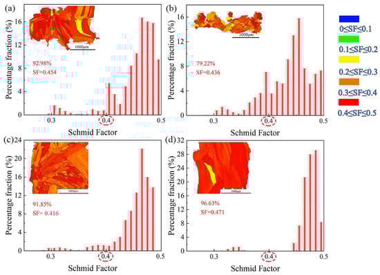 where is the orientation factor or SF. The investigation carried out by Gussevet et al. [33] revealed that the Schmid factor (SF) exceeds 0.4 for soft orientations, while it drops below 0.35 for hard orientations. A higher orientation factor indicates an increased likelihood of grain deformation, facilitating its occurrence. Conversely, a lower orientation factor signifies heightened resistance to grain deformation, making the process more intricate to initiate. In Figure 9d, the grain structure was mostly covered by red, indicating that the SF of the single wall was larger than bulk, and the probability of slip was also larger than bulk. The grain structure in Figure 9a–c was covered in orange, which indicates that the SF of the X-Y lap joint was smaller than that of the non-lap joint grain and the probability of slip was lower than that of the non-lap joint grain.
