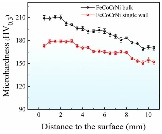 Figure 10 illustrates the results of the microhardness test conducted on FeCoCrNi-LMD samples. The highest microhardness value observed in the bulk material was 210.6 HV0.3, while the highest microhardness value in the single wall was 180.5 HV0.3. The general trend depicted in the results indicates that the microhardness value decreases with an increase in the number of layers. When comparing materials produced under the same process parameters, the bulk material exhibited higher hardness than the single wall. The difference in microhardness can be primarily attributed to the average grain size and the original dislocation density of the material. According to the Hall–Petch formula, smaller grain sizes correspond to higher hardness values. Moreover, the dislocation density also influences the material’s microhardness. Although the EBSD results indicate some variation in dislocation density, the difference was relatively small, resulting in a relatively weak impact on dislocation strengthening. The significant increase in hardness observed is primarily attributed to the process of grain refinement [34].