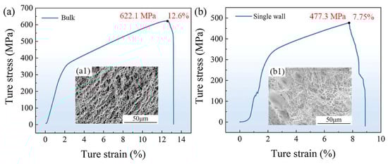 Tensile test results and fracture micro morphology of FeCoCrNi-LMD: (a) stress–strain curve and (a1) microstructure of fracture surface of the bulk; (b) stress–strain curve and (b1) microstructure of fracture surface of the bulk.