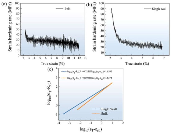 Strain hardening rate and strain hardening exponent curves of the FeCoCrNi-LMD: (a) strain hardening rate of bulk; (b) strain hardening rate of single wall; (c) strain hardening exponent curve of FeCoCrNi-LMD.