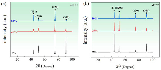 XRD patterns of FeCoCrNi-LMD bulk and single wall with different rolling deformation: (a) bulk; (b) single wall.