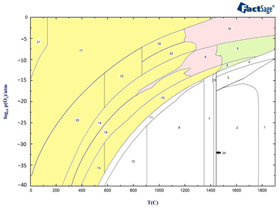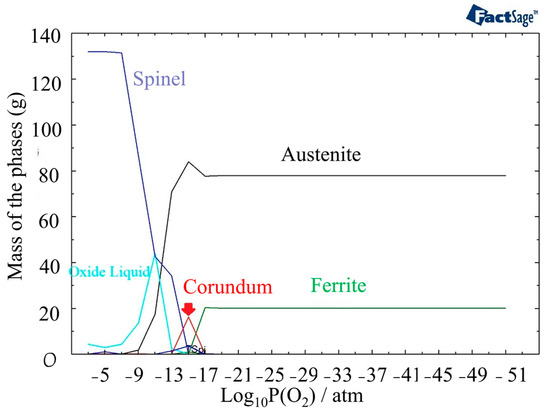Oxide formation is initiated at a higher partial pressure of oxygen, specifically at a level of 10−17 atm, when the temperature reaches 1400 °C (Figure 6). This indicates that the oxide formation process is more favorable at higher temperatures compared to 800 °C. The amount of the Corundum phase becomes less and appears between 10−17 atm and 10−13 atm. Oxide liquid starts to form after a partial pressure of oxygen of 10−16 atm in the outer layer of oxide, but it is less stable than the Spinel phase.