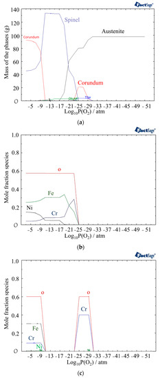 In Figure 4, the mass fractions of different phases at 800 °C under different partial pressures of oxygen are shown using the Equilib module of FactSage software version 8.2 (Thermfact Ltd., Mount Royal, QC, Canada). The figure indicates the presence of the Corundum phase for two different ranges of partial pressures of oxygen. The first layer of Corundum, which contains chromium, nickel, and oxygen, is present between 10−31 and 10−27 atm, while the second layer, which is the outer layer of the oxide and begins at 10−9 atm, contains Cr, Fe, Ni, and oxygen (Figure 5c). The other phase observed after 10−25 atm is the Spinel phase consisting of Ni, Fe, Cr, and oxygen. In the Spinel phase, chromium is found to be more stable until around a 10−12 atm partial pressure of oxygen, followed by iron becoming more stable. Nickel is formed at 10−15 atm and becomes more stable than chromium after 10−9 atm (Figure 5b).