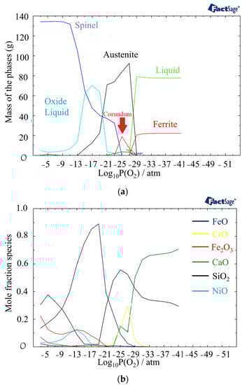 (a) Mass fraction of different phases at 1440 °C as a function of partial pressure of oxygen. (b) Component distribution in the oxide liquid phase.