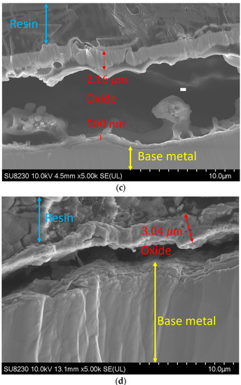 Oxide layer at a distance of 1.5 mm from the fusion line: (a) 50 ppm, (b) 200 ppm, (c) 500 ppm, and (d) 5000 ppm.